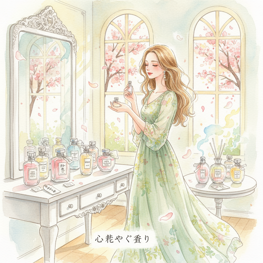 春の柔らかな陽射しが差し込む窓辺で、私は今夜のパーティーに向けて香りのコスメを選んでいました。dresserの上に並んだ香水やボディミストの瓶たちが、まるで宝石のように輝いています。今夜は大切な友人の婚約パーティー。私も特別な一日になることを予感していました。