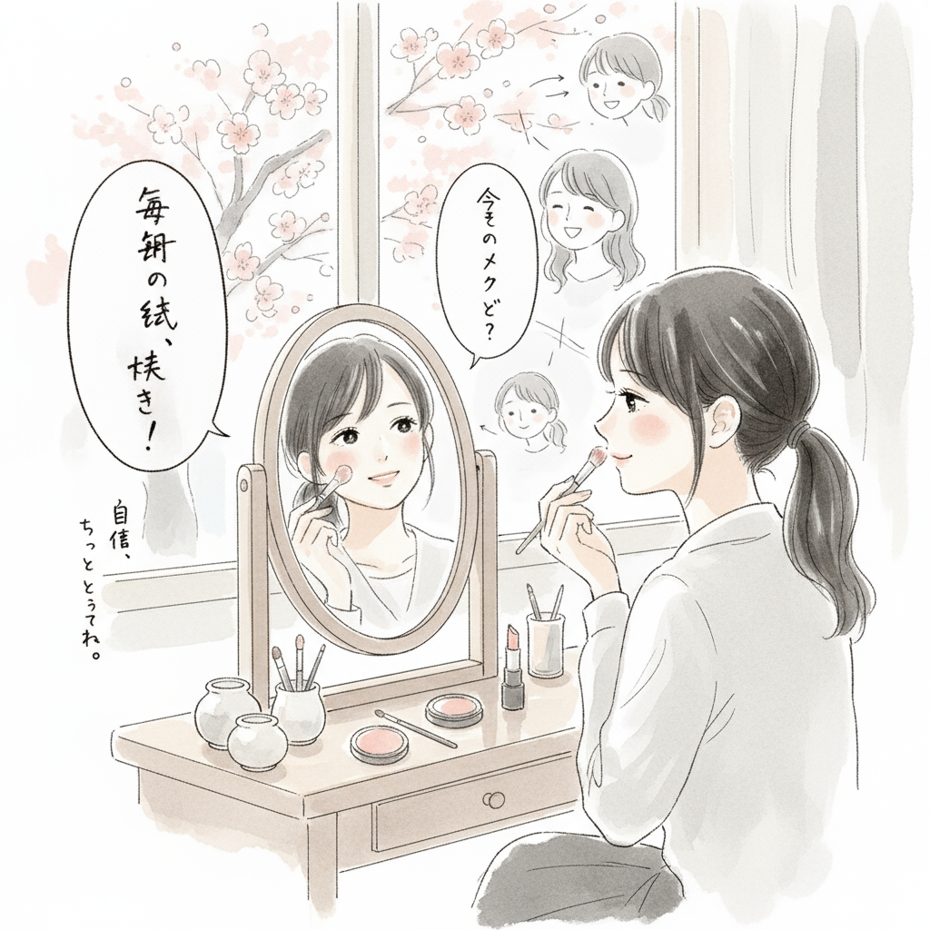 メイクを始めてから、鏡を見るのが楽しくなりました。以前は気になっていた肌の悩みも、上手にカバーできるようになって自信が持てるようになったんです。でも一番大切なのは、すっぴんの自分も大切にすること。夜はしっかりとクレンジングして、肌をいたわることも忘れません。