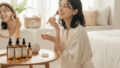 「おはよう」と小さく呟きながら、まずは化粧水をコットンに含ませます。優しく肌を整えていくと、今日も頑張ろうという気持ちが湧いてきます。化粧水の後は、みずみずしい乳液で保湿。カサカサした肌がしっとりとしてきて、これだけでも気分が上がります。