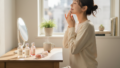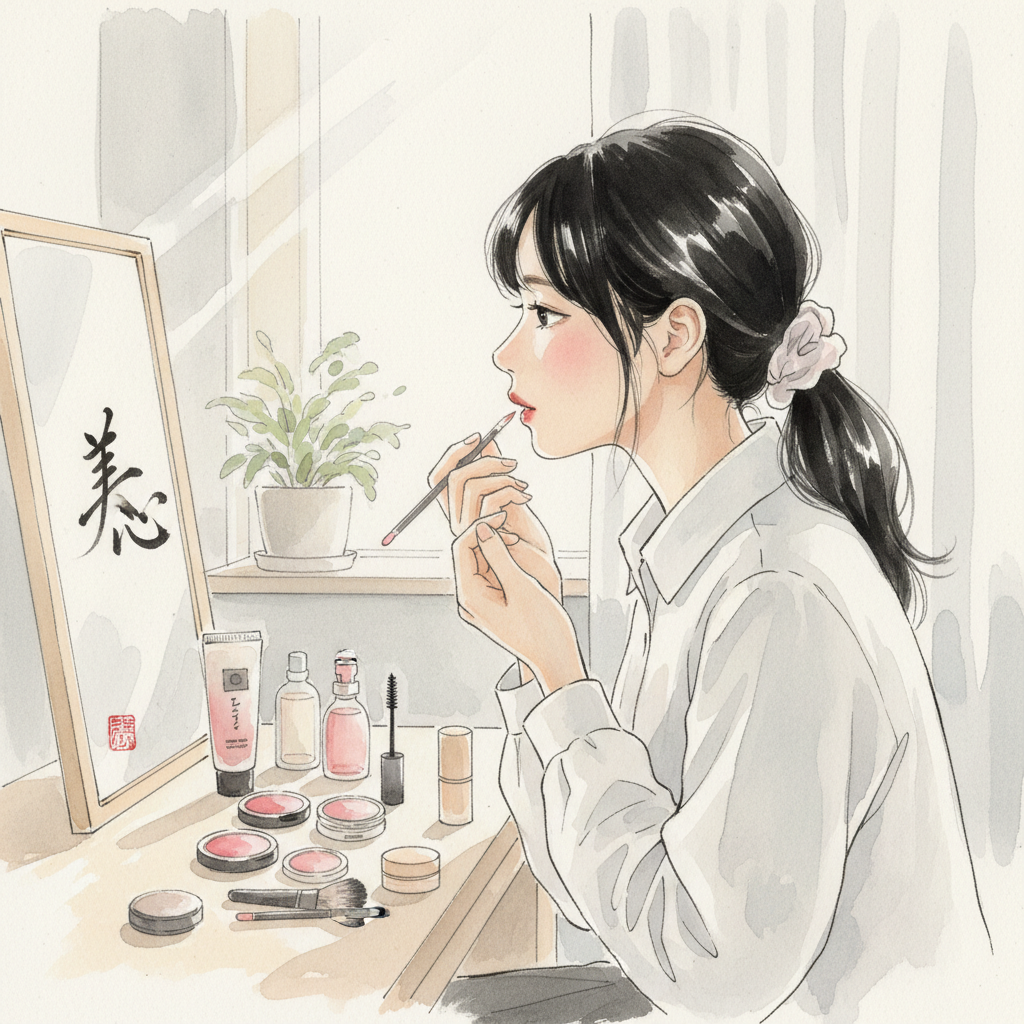 朝の光が薄いカーテン越しに差し込んでくる六時半。まだ少し肌寒い四月の空気が、開けた窓からそっと部屋に入ってくる。私は洗面台の前に座り、鏡の中の自分と向き合っていた。まだ眠たげな目元、少しくすんだ頬。これが素の私だ。