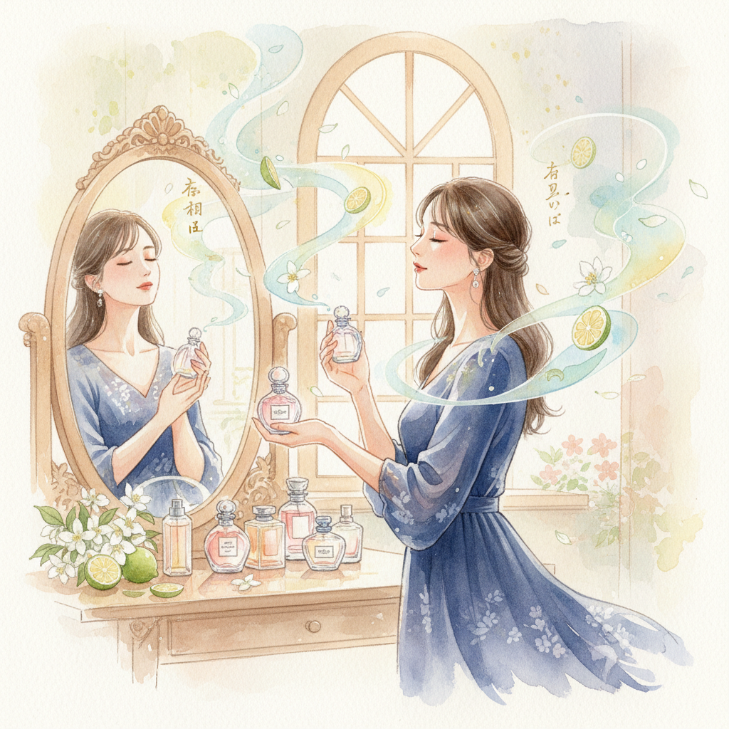 鏡に映る自分を見つめ、最後にもう一度、手首に鼻を近づける。ほのかに香るベルガモットとジャスミンの調べ。これでいい、と心の中で頷く。コスメポーチを閉じ、クラッチバッグに香水のミニボトルを忍ばせる。パーティーの途中で、そっと香りを纏い直すために。