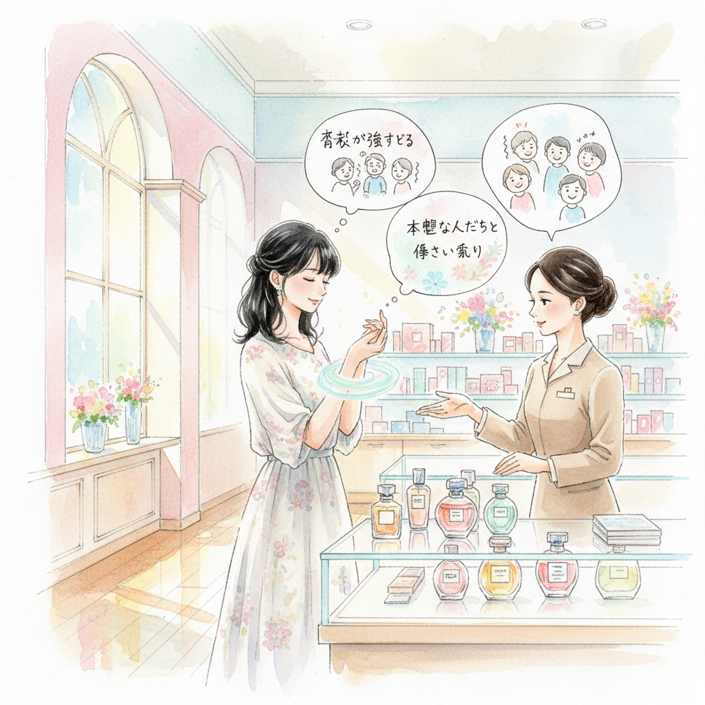 デパートのコスメフロアに着いたのは午後4時過ぎだった。西日が差し込む売り場で、私はいつものように迷っていた。フローラル系の甘い香りが鼻をくすぐる。隣のカウンターからはシトラスの爽やかな匂いが漂ってくる。BAさんが微笑みながら近づいてくるのが見えて、思わず一歩後ずさりしてしまう自分がいる。
