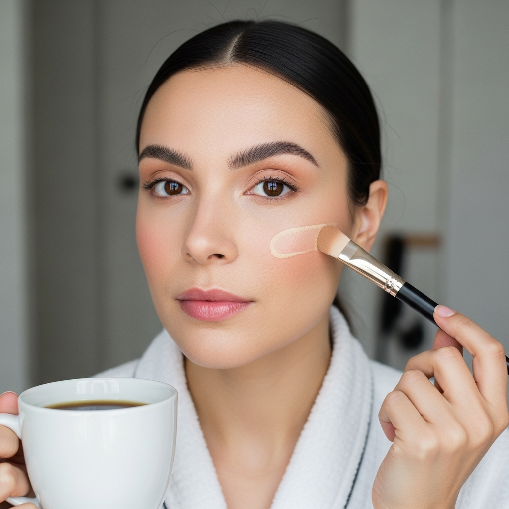 リップは迷った。ベージュにしようか、それとも少し赤みのあるローズにしようか。コーヒーカップを持ちながらしばらく考えて、結局ローズを選んだ——そのとき、うっかりカップを傾けすぎてテーブルにコーヒーが一滴落ちた。鏡の中の自分と目が合って、なんとなく笑ってしまった。リラックスしすぎたかもしれない。