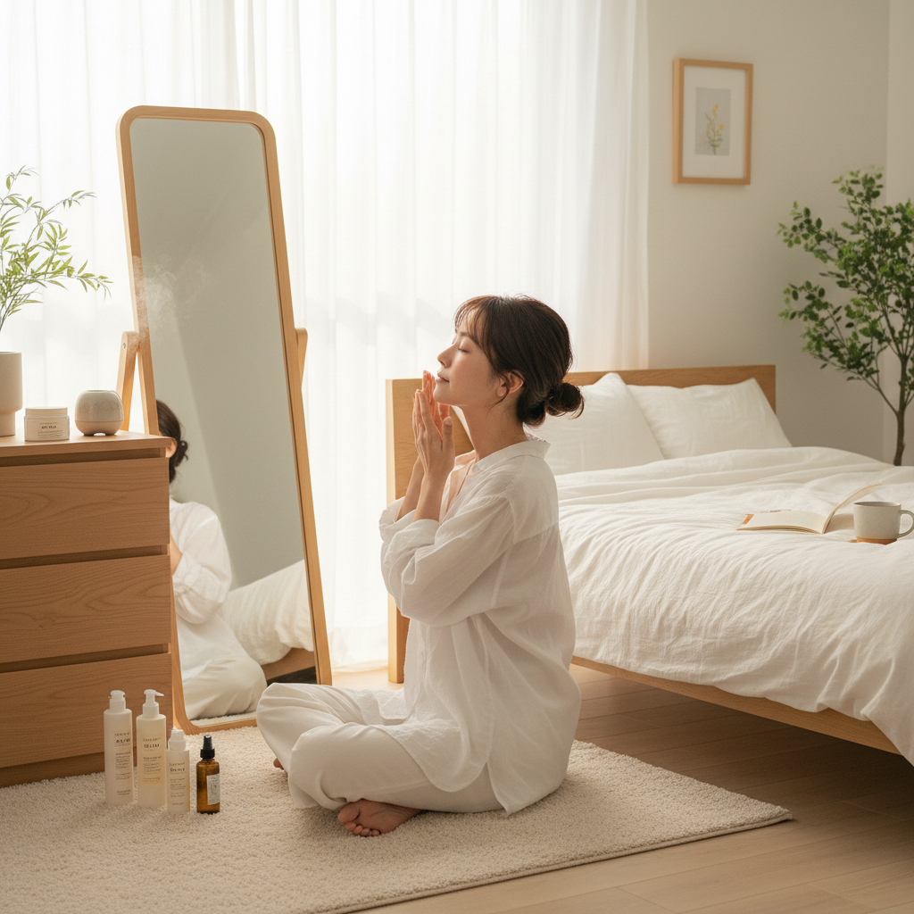 目覚ましをかけない土曜日の9時半、カーテンの隙間から差し込む光が妙に優しくて、あ、今日は何もしなくていい日だって体が理解する瞬間が好きだ。布団の中でぼんやりスマホを見て、SNSを開いて、また閉じて。誰かに会う予定もない。仕事のメールも来ない。こういう日こそ、私は洗面所に立って、引き出しの奥にしまってある小さなガラス瓶を取り出す。