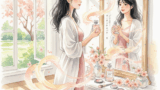 バスタイムを終えて、お気に入りのバスローブに身を包みます。窓際の小さなカフェスペースで、ハーブティーを淹れながら、メイクの準備を始めます。今日は普段のようなフルメイクではなく、素肌を活かしたナチュラルメイクにしようと決めていました。