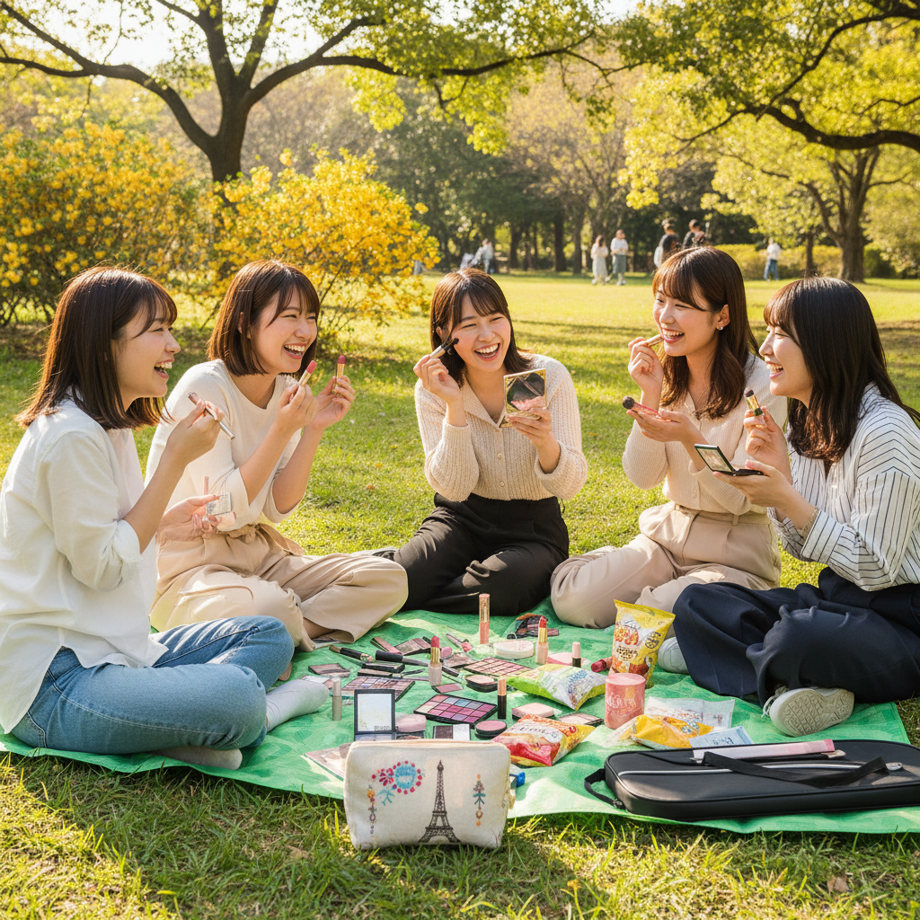 私は自分のリップを塗り直しながら、公園でメイクするってなんだか不思議な感じだなって思った。家でも駅のトイレでもなく、太陽の下で。光の加減が全然違うから、いつもと同じ色なのに違って見える。友人が「外で塗ると発色がよく分かるよね」って言ってて、確かにそうかもって納得した。