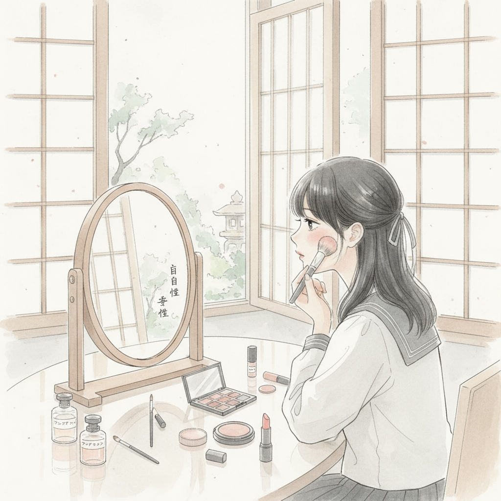 朝の光が差し込む部屋で、制服に着替えた彼女は鏡の前に座った。ドレッサーの上には、お小遣いを貯めて少しずつ集めたコスメたちが並んでいる。派手なメイクをするわけではない。ただ、自分らしくいるために、彼女は毎朝この時間を大切にしている。