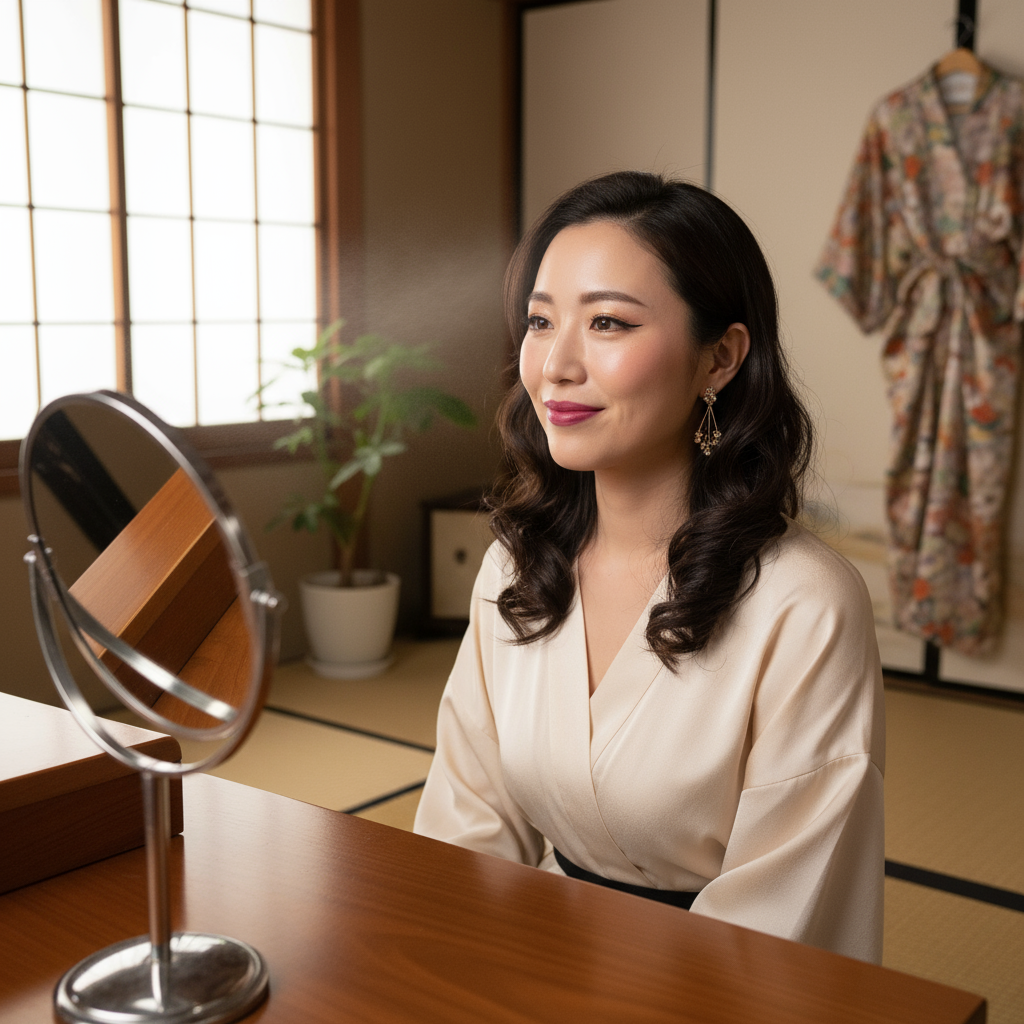 鏡に映る自分の姿に、満足げな微笑みがこぼれます。いつもの私とは少し違う、でも自然体な仕上がり。このメイクなら、パーティーの間中自信を持っていられそうです。