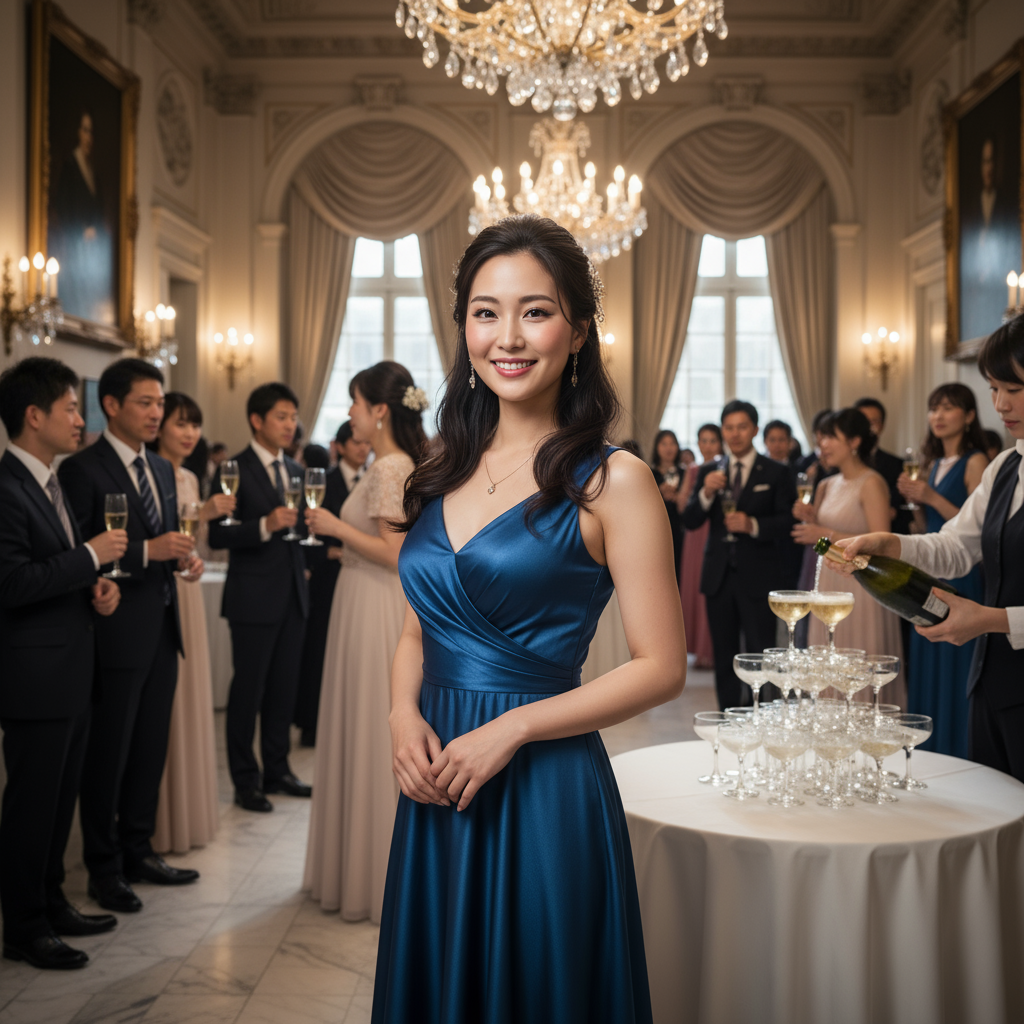 パーティー会場に一歩足を踏み入れると、シャンパンの栓を開ける音と、華やかな会話が耳に届きます。照明に照らされた空間で、私のメイクは期待通りの輝きを放っています。今夜という特別な時間を、心ゆくまで楽しもう。そんな決意と共に、私は優雅に微笑みながら、会場の中へと歩みを進めていきました。