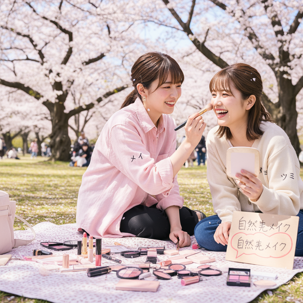春風が吹くたびに、桜の花びらが舞い落ちてきます。その様子を見ながら、由美が「自然の中にいると、メイクも自然体でいいんだって改めて気づくね」とつぶやきました。その言葉に、私たちは深くうなずきます。