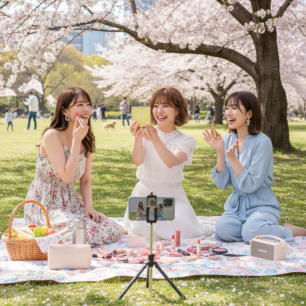 公園に着くと、すでにユキとミサが芝生の上でレジャーシートを広げていました。「おはよう!」と手を振る二人の顔には、春の日差しに負けないような明るい笑顔が輝いています。私たち3人は大学時代からの親友で、休日になるとよくこうして集まっては、メイクやファッションの話で盛り上がるんです。
