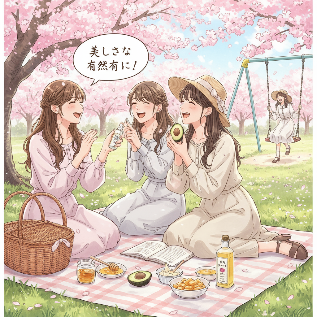 公園に到着すると、満開の桜の下でシートを広げました。青空が広がり、穏やかな太陽の光が私たちを優しく包み込みます。友人のマリは最近ナチュラルコスメにはまっていて、手作りスキンケアの話で盛り上がっています。