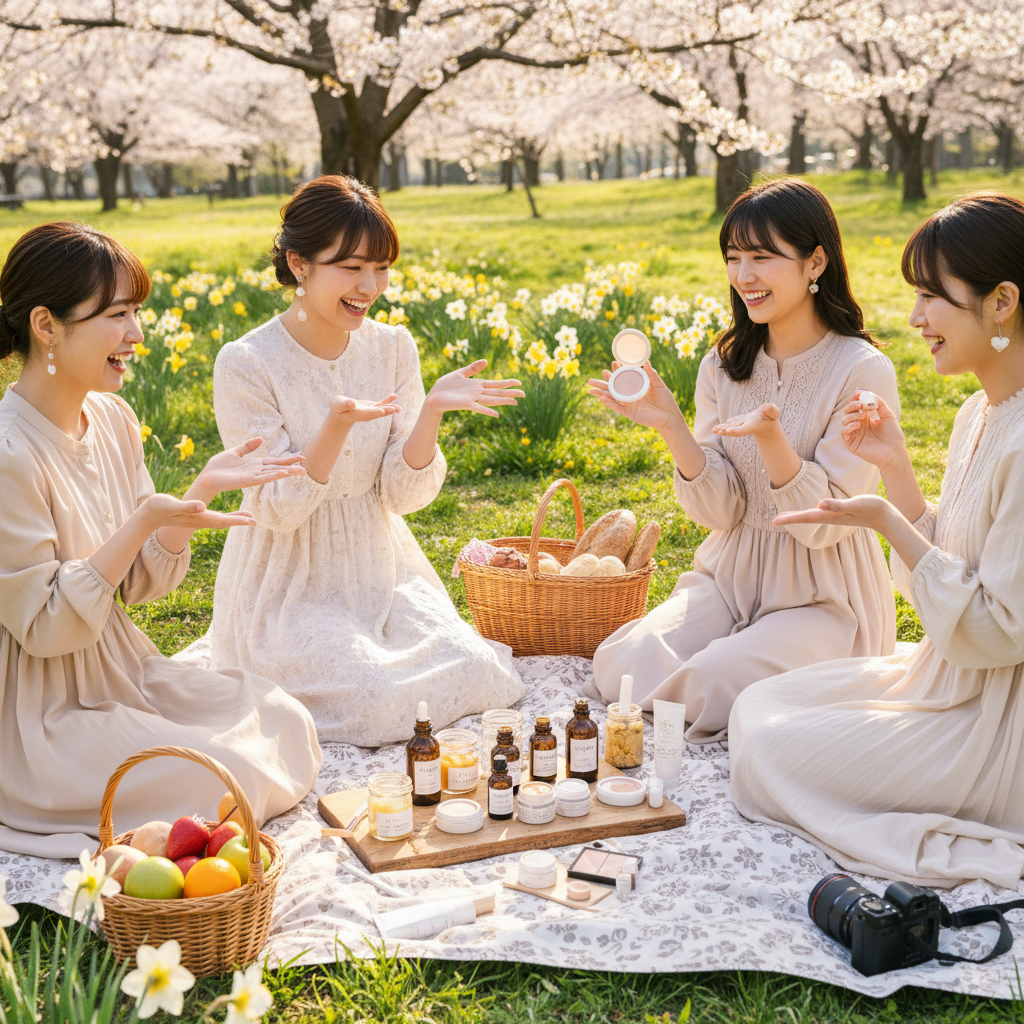 友人のミキは、私の話を聞きながら、自分のポーチからコスメを取り出しました。「私も最近ナチュラルコスメに興味があるんだ!」と言って、お互いのお気に入りコスメを見せ合うことに。芝生の上に広げられたコスメたちは、まるで小さな化粧品店のよう。春の柔らかな日差しを浴びながら、私たちはメイクの話に花を咲かせました。