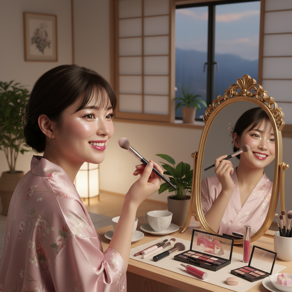 メイクを終えた私は、全体のバランスを確認する。パーティーメイクで大切なのは、どの角度から見ても美しく、そして自然に見えること。強すぎず、弱すぎず。ちょうどいい加減を見つけることが、洗練された印象を作り出すポイントだ。