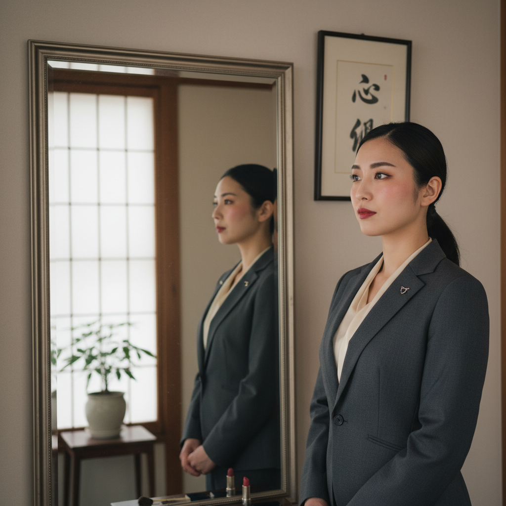 スーツを着て、もう一度鏡の前に立つ。ネイビーのジャケットに白いブラウス、膝丈のタイトスカート。足元は黒のパンプス。メイクとスーツが合わさって、完全に「仕事モード」の私が完成する。プライベートの私とは明らかに違う、オフィスという戦場で戦うための顔。
